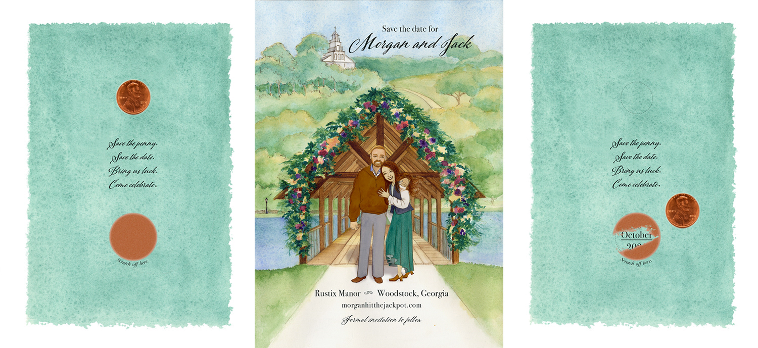 The bride's grandfather had recently passed away. His penny collection inspired the pennies used on the Save-the-Date and on the invitation. Above left is the back of the invitation, with the penny attached. Invitees were instructed to scratch off the copper circle with the date-to-save printed underneath (above right).